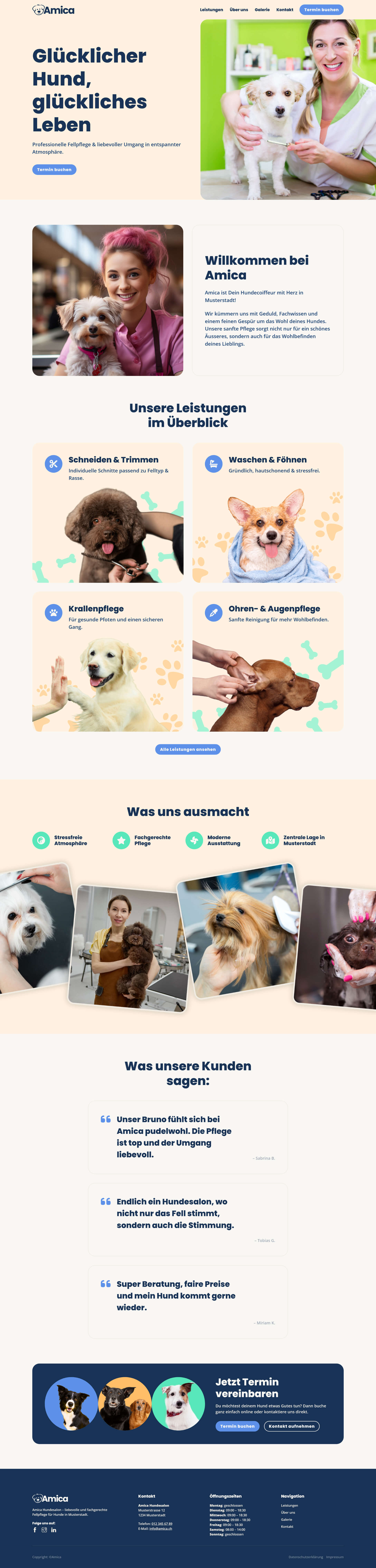 Vorteil: Alle wichtigen Seiten sind bereits vorbereitet – Ihr Hundesalon ist innert kürzester Zeit professionell online sichtbar.