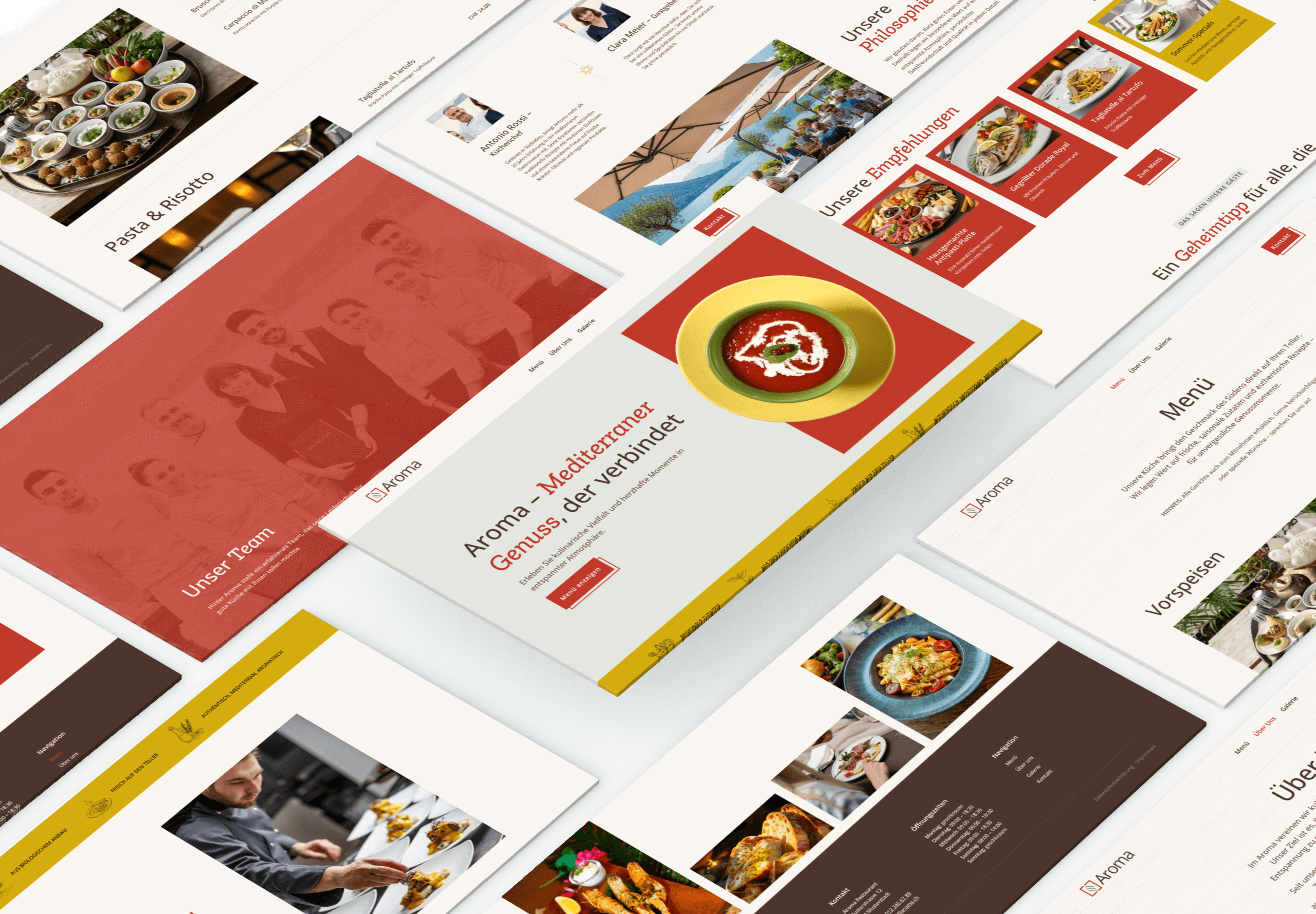 Dieses Template eignet sich für Restaurants, Cafés oder Betriebe im Gastgewerbe. Mit warmen Rot- und Gelbtönen sowie klarer Typografie vermittelt das Design mediterrane Leichtigkeit und Gastfreundschaft. Bildstarke Elemente wie Menü-Empfehlungen und Food-Fotografie laden zum Entdecken ein. Die Struktur ist auf Genuss und unkomplizierte Information ausgerichtet – von Speisekarte bis Standort.